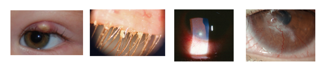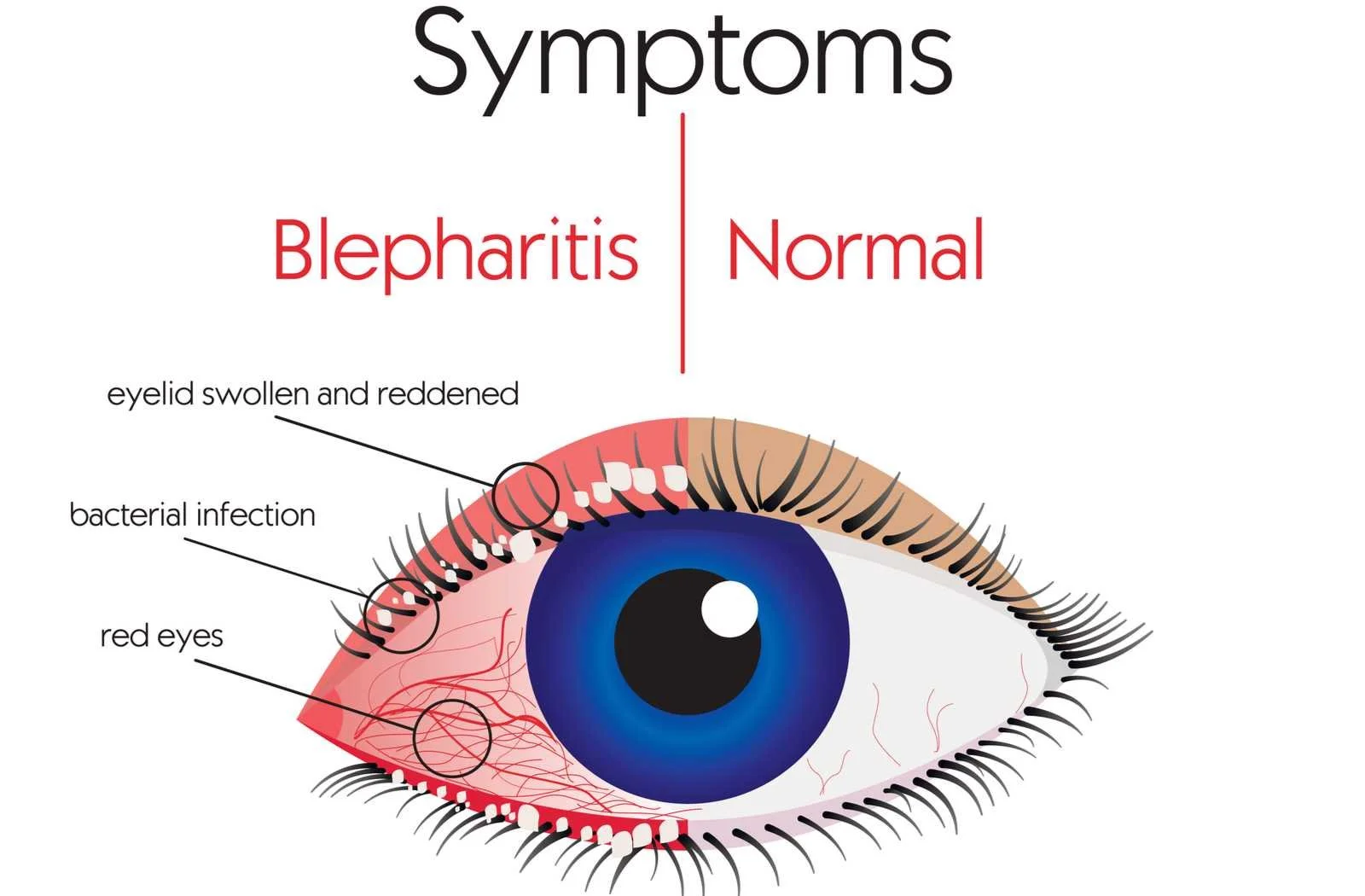 Your eyelids contain tiny glands that make oil which keeps your eyes moist. In blepharitis, these glands become blocked, which causes your eyelids to become irritated and some children get styes/bumps in their eyelids. In some cases, dandruff-like flakes build up at the base of the eyelashes. It is thought that in some children blepharitis is caused by sensitivity to the bacteria (staphylococcus) which normally live on the skin. The surface of the eye can become inflamed. The eye becomes red and sore and may develop small white ulcers around the edge of the cornea.