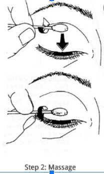 Remove the warm compress and gently massage the lower lid near the lid margin with your finger, rolling your finger upward in a rolling motion (do not touch the eye)